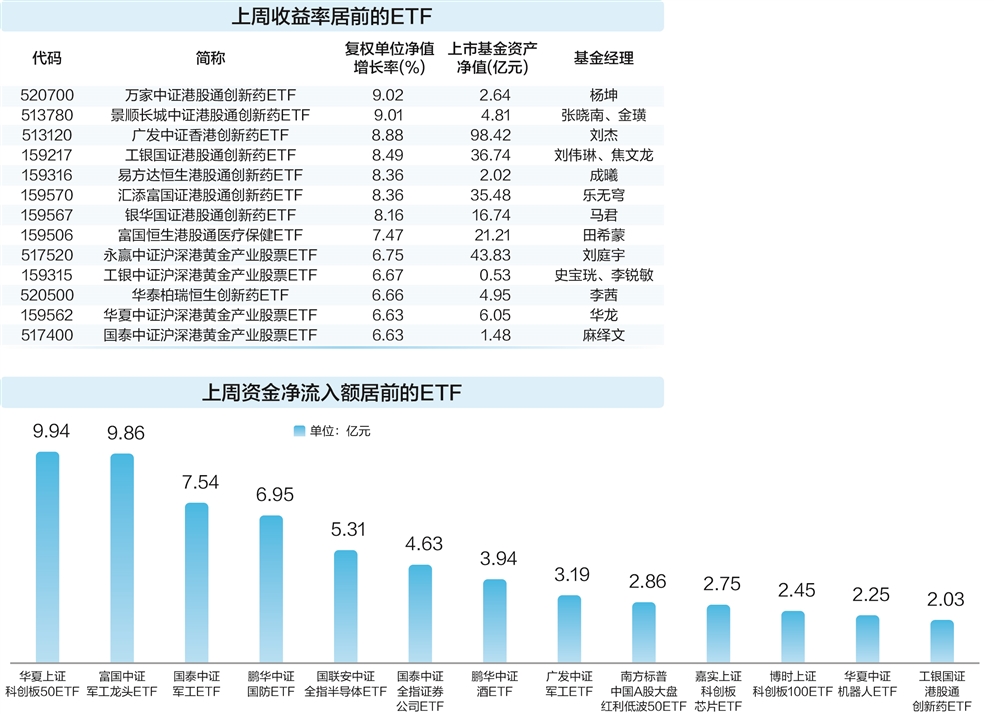上周(5月19日至23日),创新药和黄金主题ETF收益率居前。此外,七部门出台相关政策加大对科技型企业的信贷支持,科创50ETF获资金青睐。